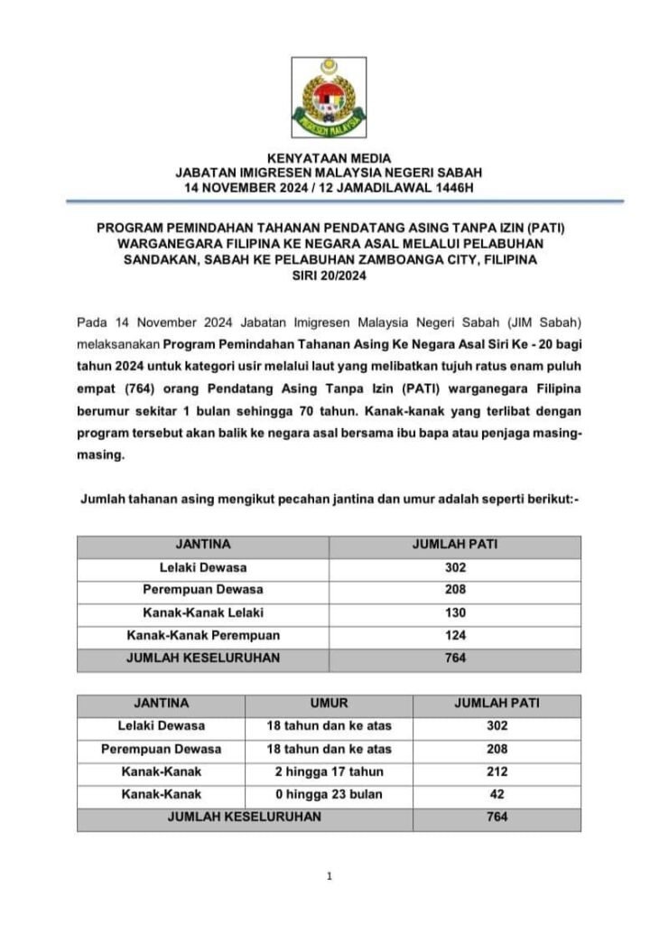 SANDAKAN – Seramai 764 pendatang asing tanpa izin (PATI) warga Filipina dihantar pulang ke negara asal melalui Pelabuhan Sandakan, semalam.