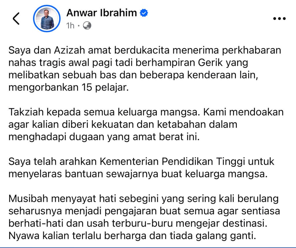 “Saya dan Azizah amat berdukacita menerima perkhabaran nahas tragis awal pagi tadi berhampiran Gerik yang melibatkan sebuah bas dan beberapa kenderaan lain, mengorbankan 15 pelajar,” katanya.
