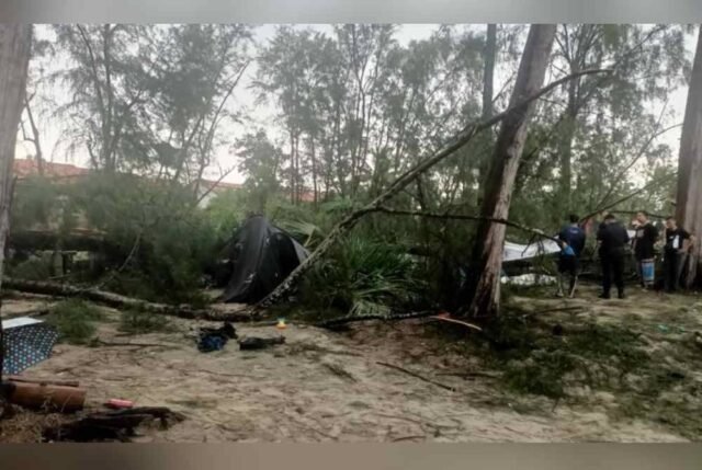 “Kejadian ribut dan angin kencang itu mengakibatkan pokok tumbang dan menghempap tapak perkhemahan di situ. Terdapat kecederaan serta kemalangan jiwa dilaporkan.
